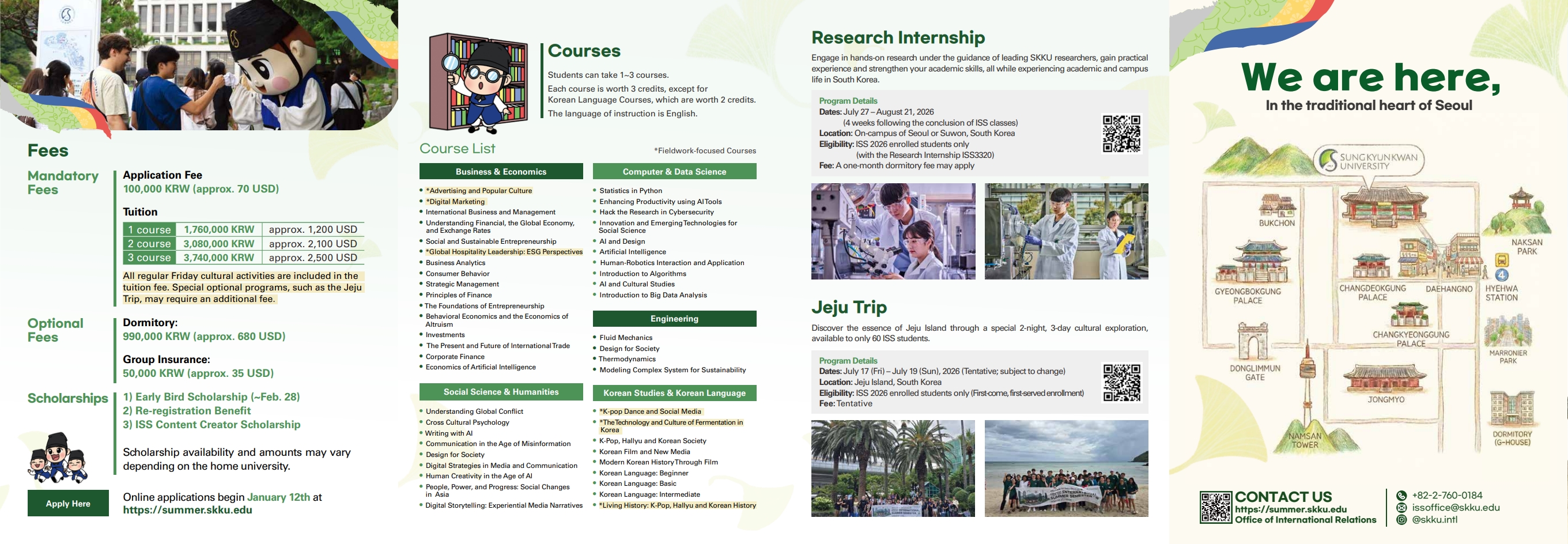 O ISS é um programa intensivo de 4 semanas, com disciplinas ministradas totalmente em inglês, que reúne estudantes de universidades parceiras do mundo todo para uma experiência acadêmica e cultural única em Seul.