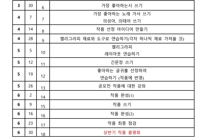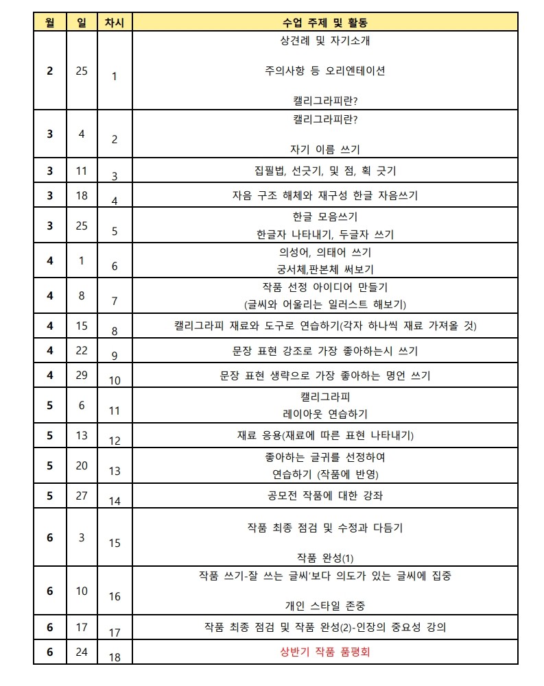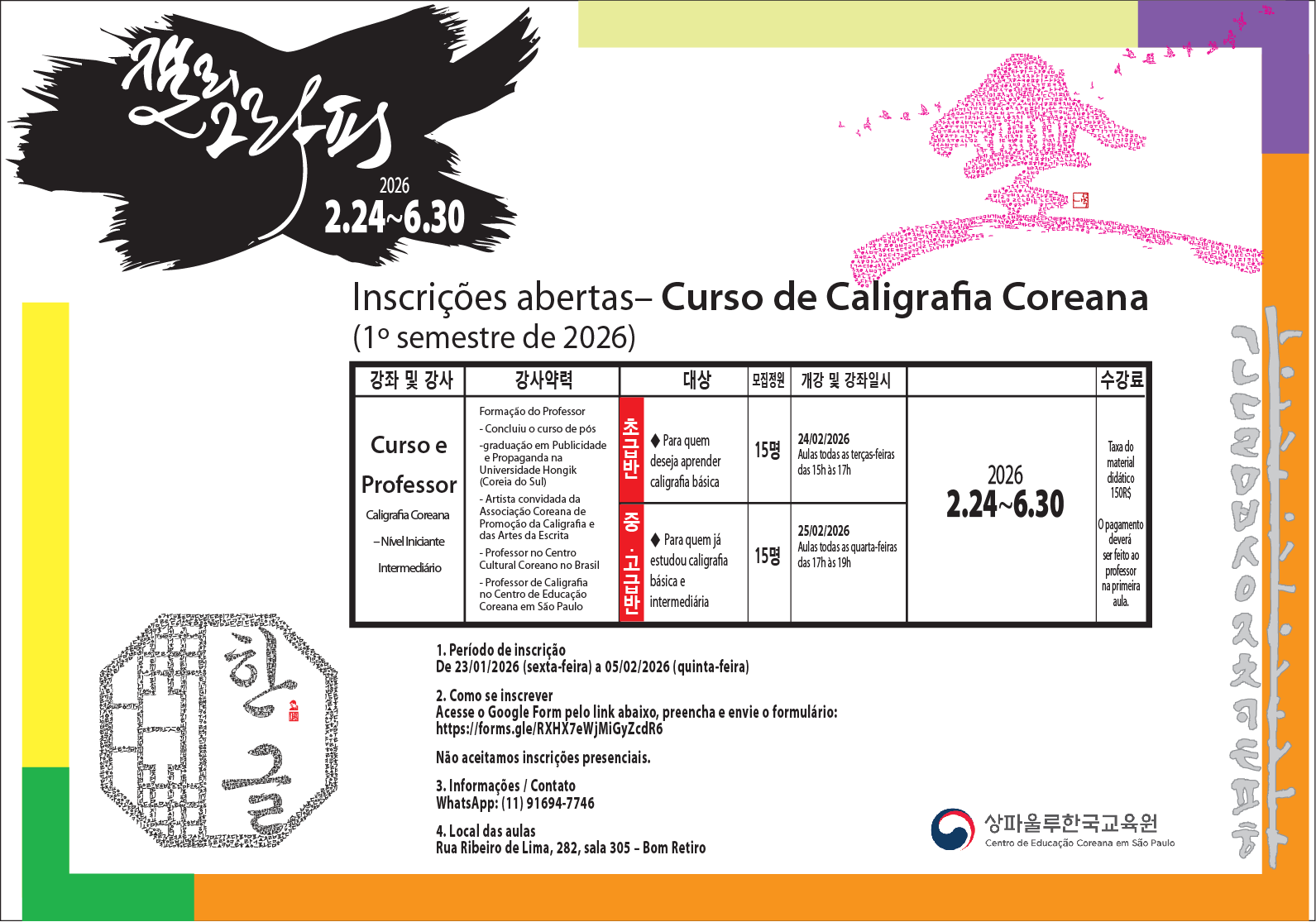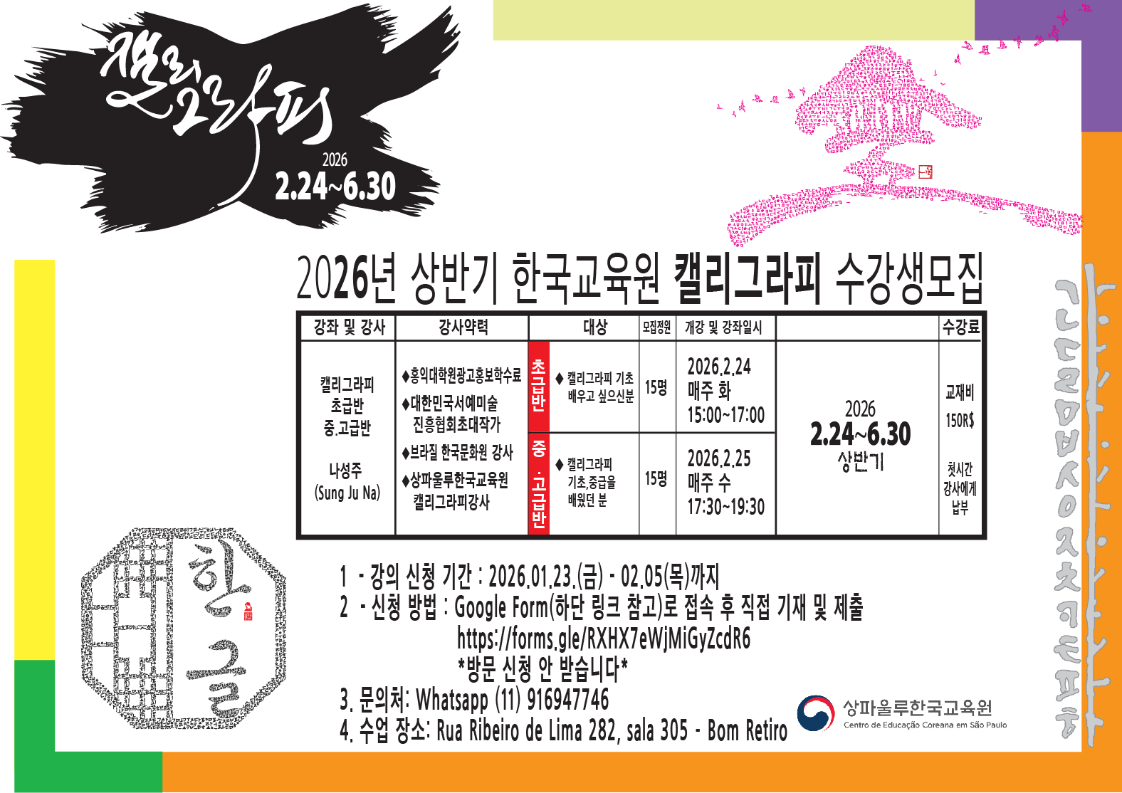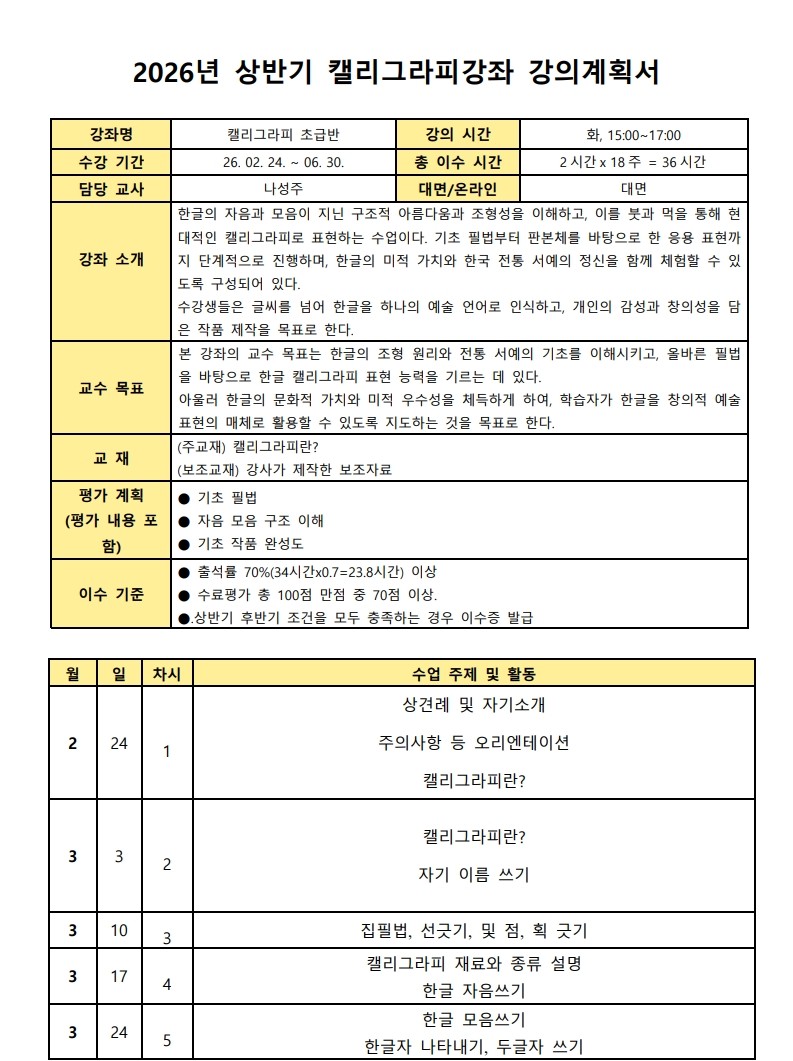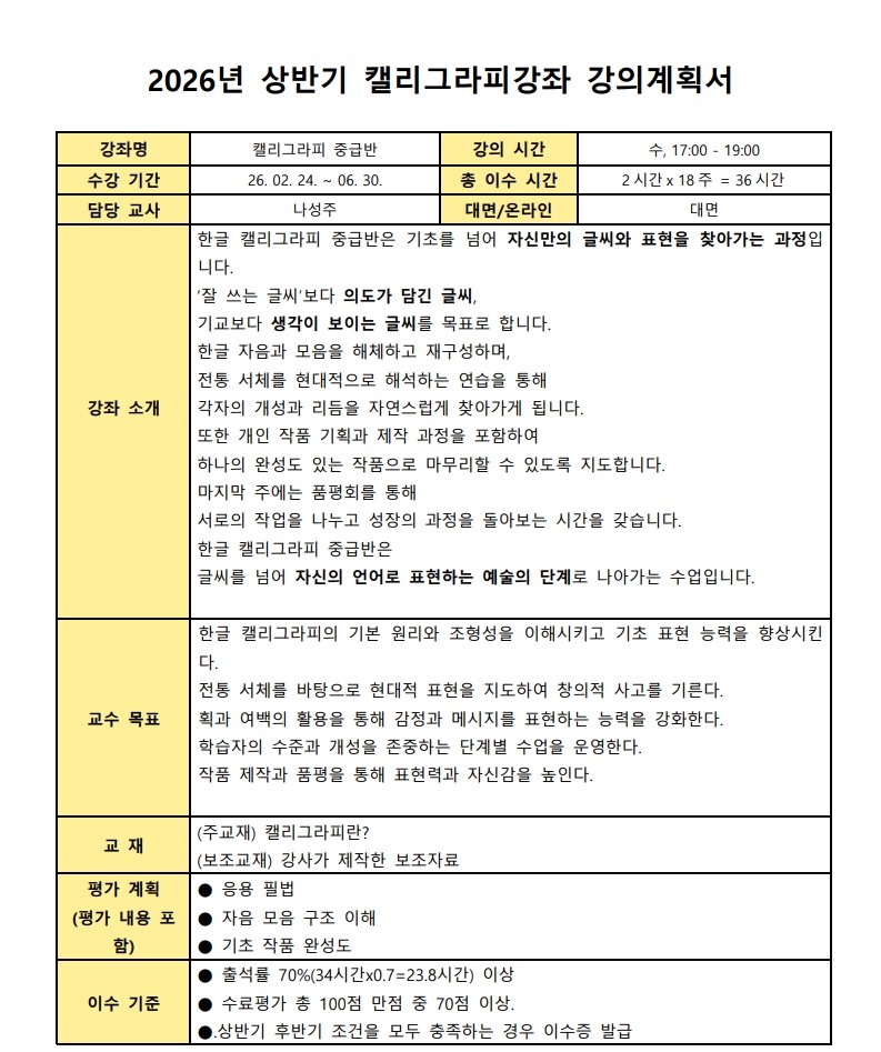 제목2026년 상반기 캘리그라피 강좌 수강생 모집 | Inscrições abertas – Curso de Caligrafia Coreana (1º semestre de 2026)2026-01-21 16:45작성자교육원첨부파일2026년 상파울루한국교육원 캘리상반기강좌 강의계획서(서식)_초급.pdf (228.5KB)2026년 상파울루한국교육원 캘리상반기강좌 강의계획서(서식)_중급.pdf (211.8KB)신청 링크: 클릭하기 Formulário de inscrição: CLIQUE AQUI 목록 이전2026년 상반기 포르투갈어 대면 강좌 수강생 모집교육원2026-01-21다음제 105회 한국어능력시험 공고 | INSCRIÇÕES PARA O 105º TOPIK교육원2026-01-15 Powered by MangBoard