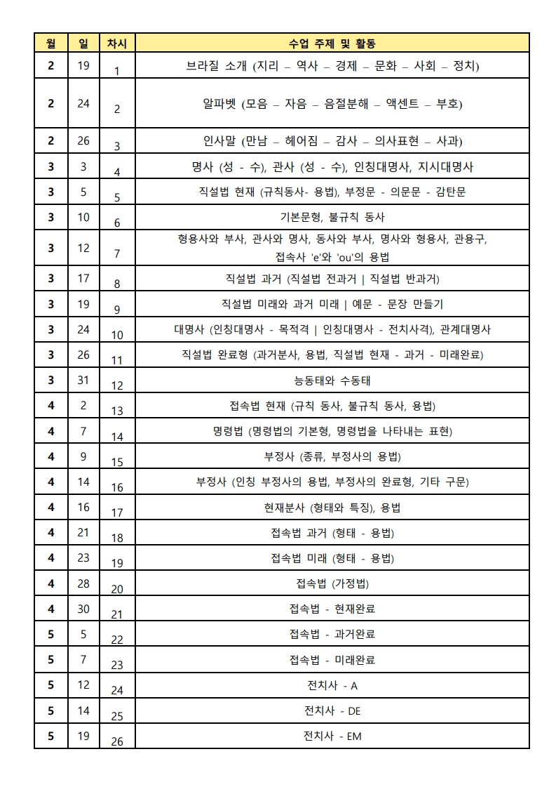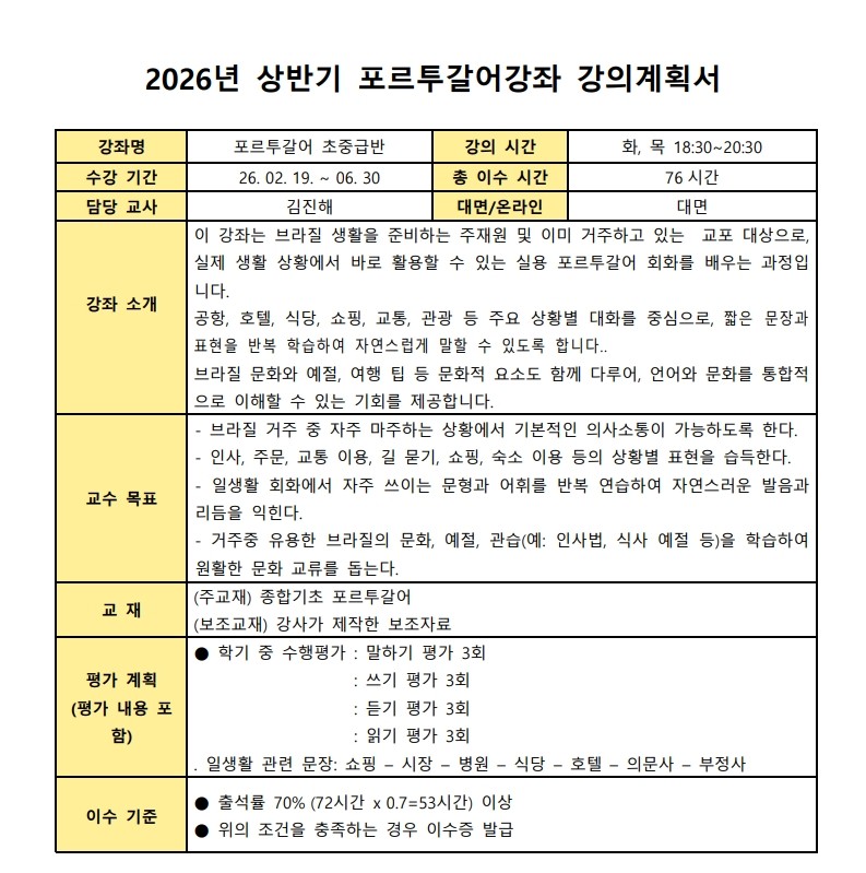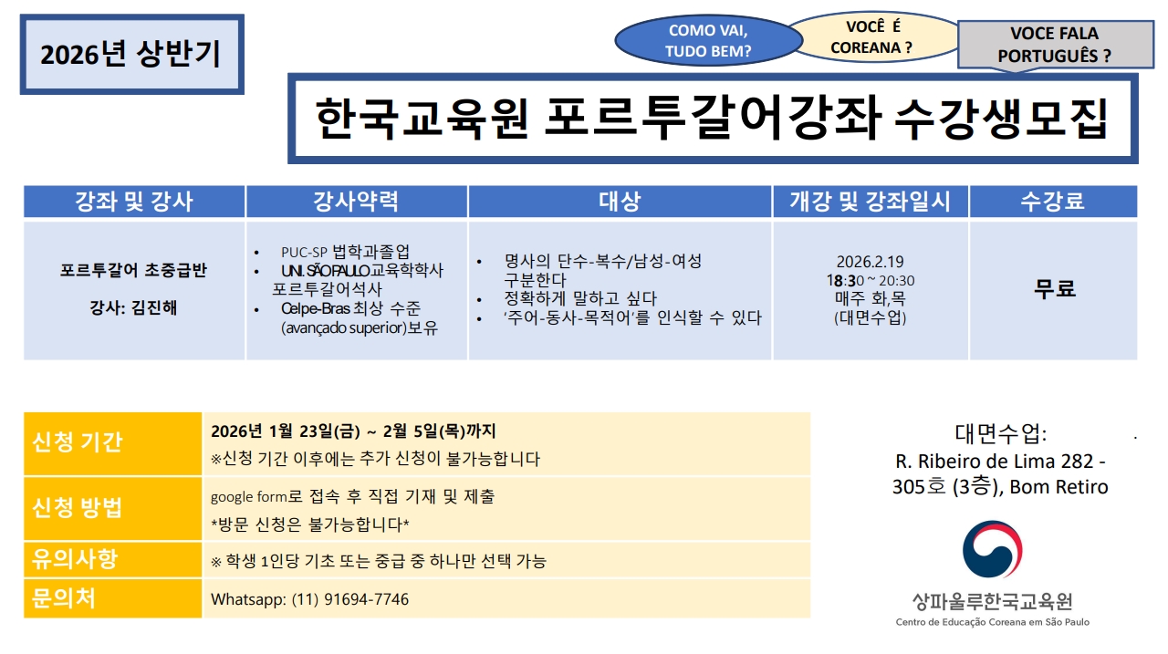 제목2026년 상반기 포르투갈어 대면 강좌 수강생 모집2026-01-21 17:01작성자교육원첨부파일2026년 상파울루한국교육원 포르투갈어 대면강좌 강의계획서.pdf (239.1KB) 신청 링크: 클릭하기 목록 이전2026년 상반기 포르투갈어 온라인 강좌 수강생 모집교육원2026-01-22다음2026년 상반기 캘리그라피 강좌 수강생 모집 | Inscrições abertas – Curso de Caligrafia Coreana (1º semestre de 2026)교육원2026-01-21 Powered by MangBoard