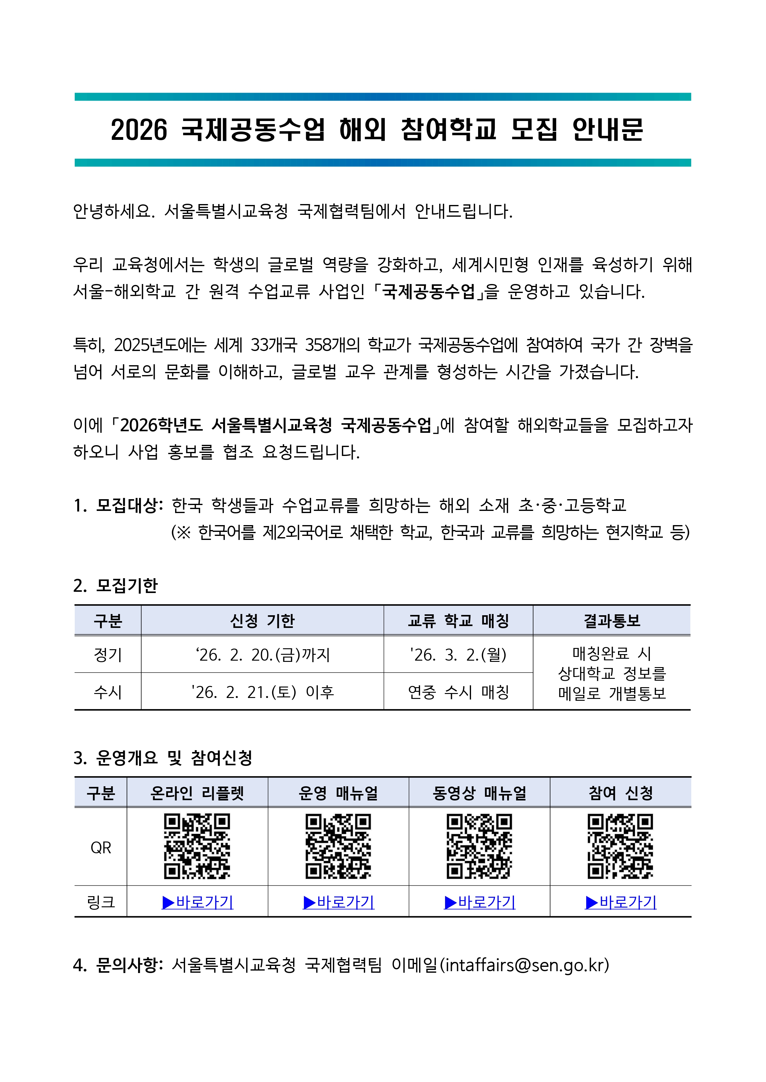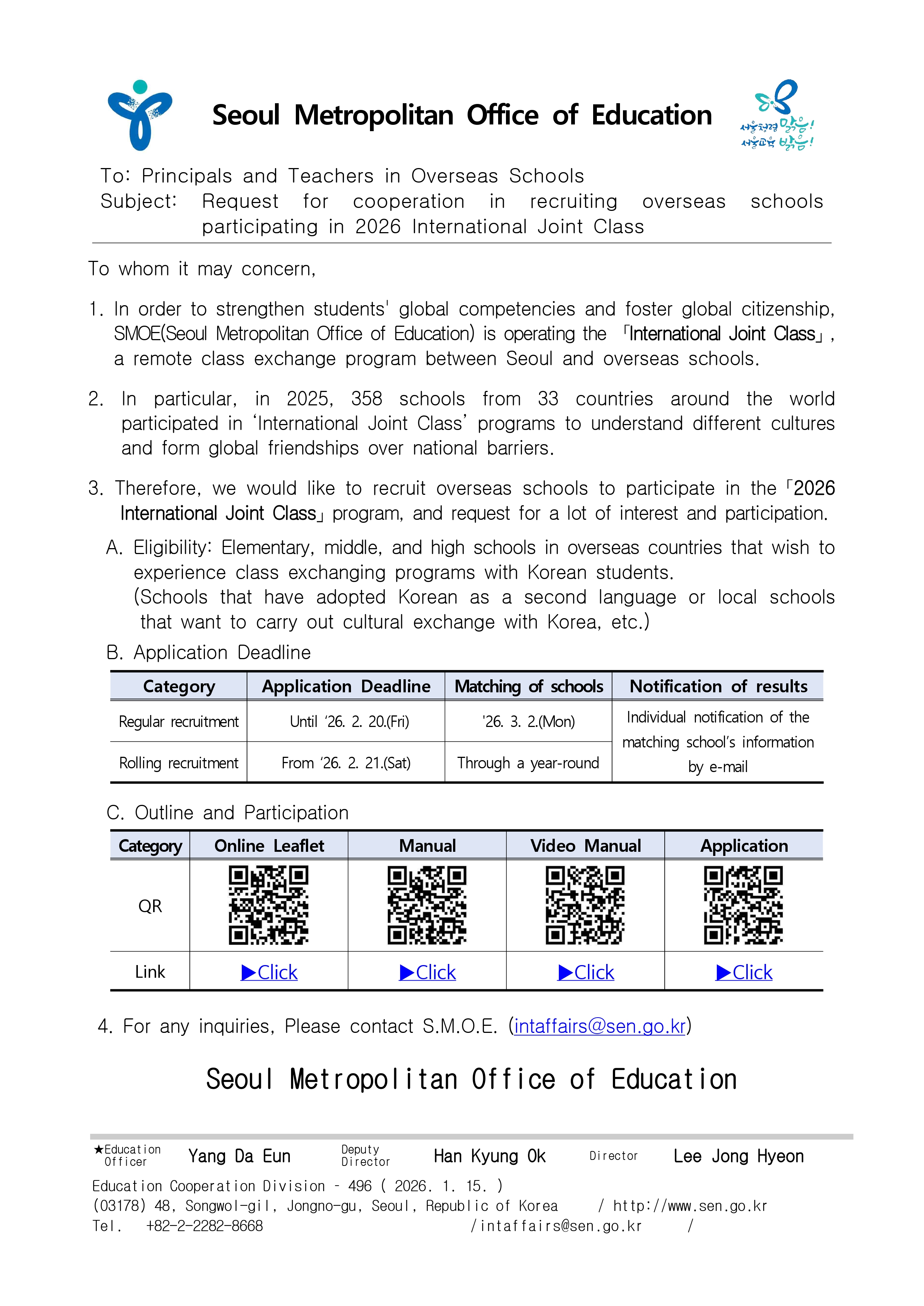 A Secretaria Metropolitana de Educação de Seul (SMOE) convida escolas estrangeiras a participarem do Programa International Joint Class 2026, um programa de intercâmbio educacional on-line realizado entre escolas de Seul e escolas de outros países.