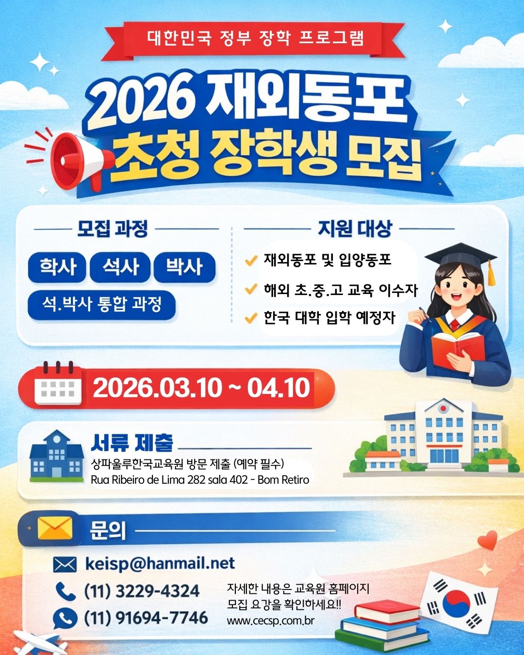 대한민국 정부에서는 재외동포 학생들을 대상으로 한국 대학에서의 학업 기회를 지원하기 위해 「2026 재외동포 초청 장학생」을 모집합니다.