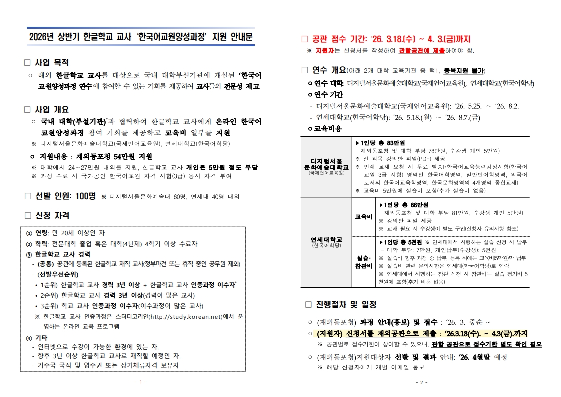 대한민국 정부에서는 해외 한글학교 교사의 전문성 강화를 위해 「2026년 상반기 한국어교원양성과정 지원 사업」을 시행합니다.