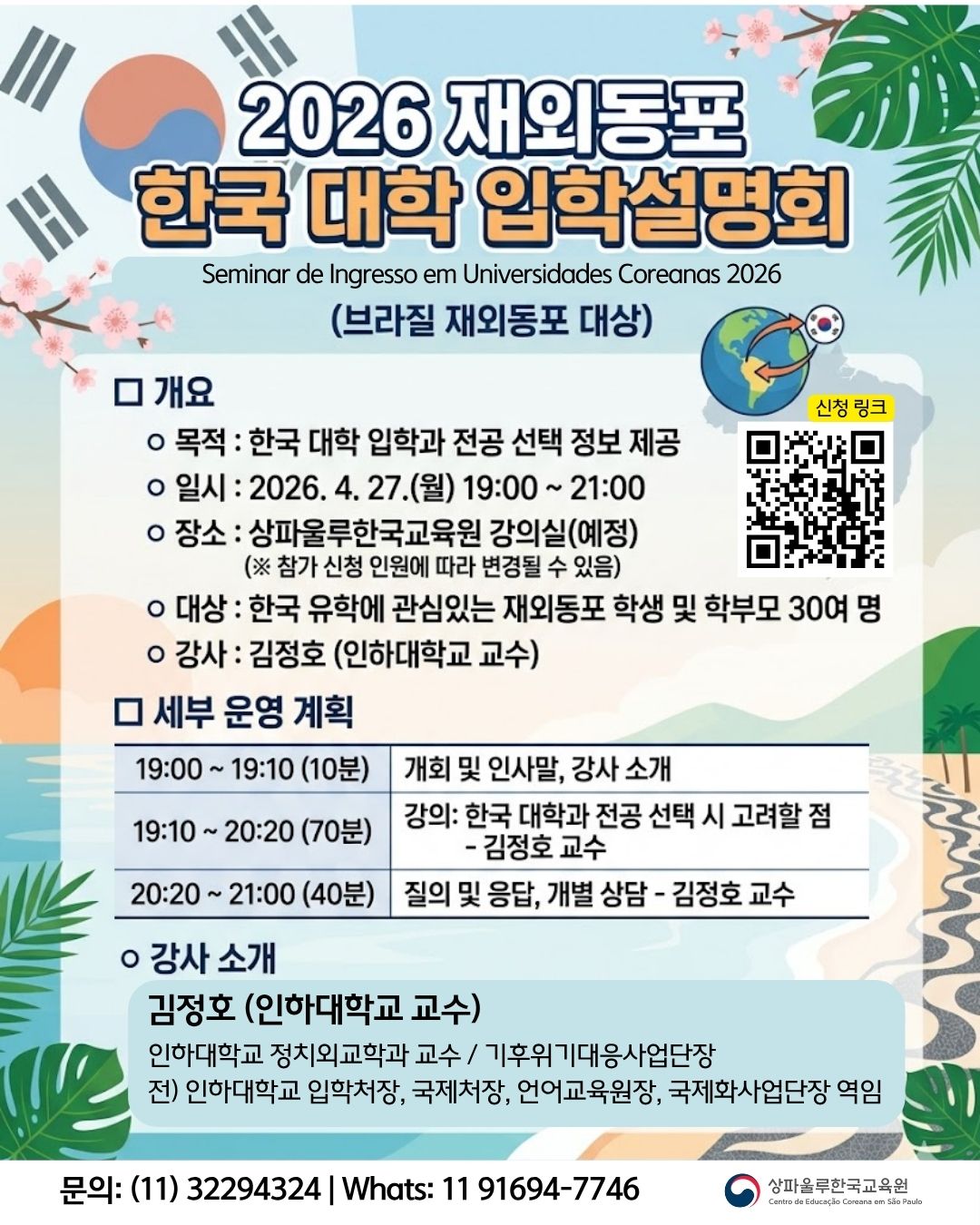 제목2026 재외동포 한국 대학 입학설명회 | Seminar de Ingresso em Universidades Coreanas 2026 para filhos coreanos2026-04-09 13:24작성자교육원 목록 이전「2026 한글학교 교사 초청연수」 참가 신청 안내교육원2026-04-17다음제 107회 한국어능력시험 공고 | INSCRIÇÕES PARA O 107º TOPIK교육원2026-04-09 Powered by MangBoard
